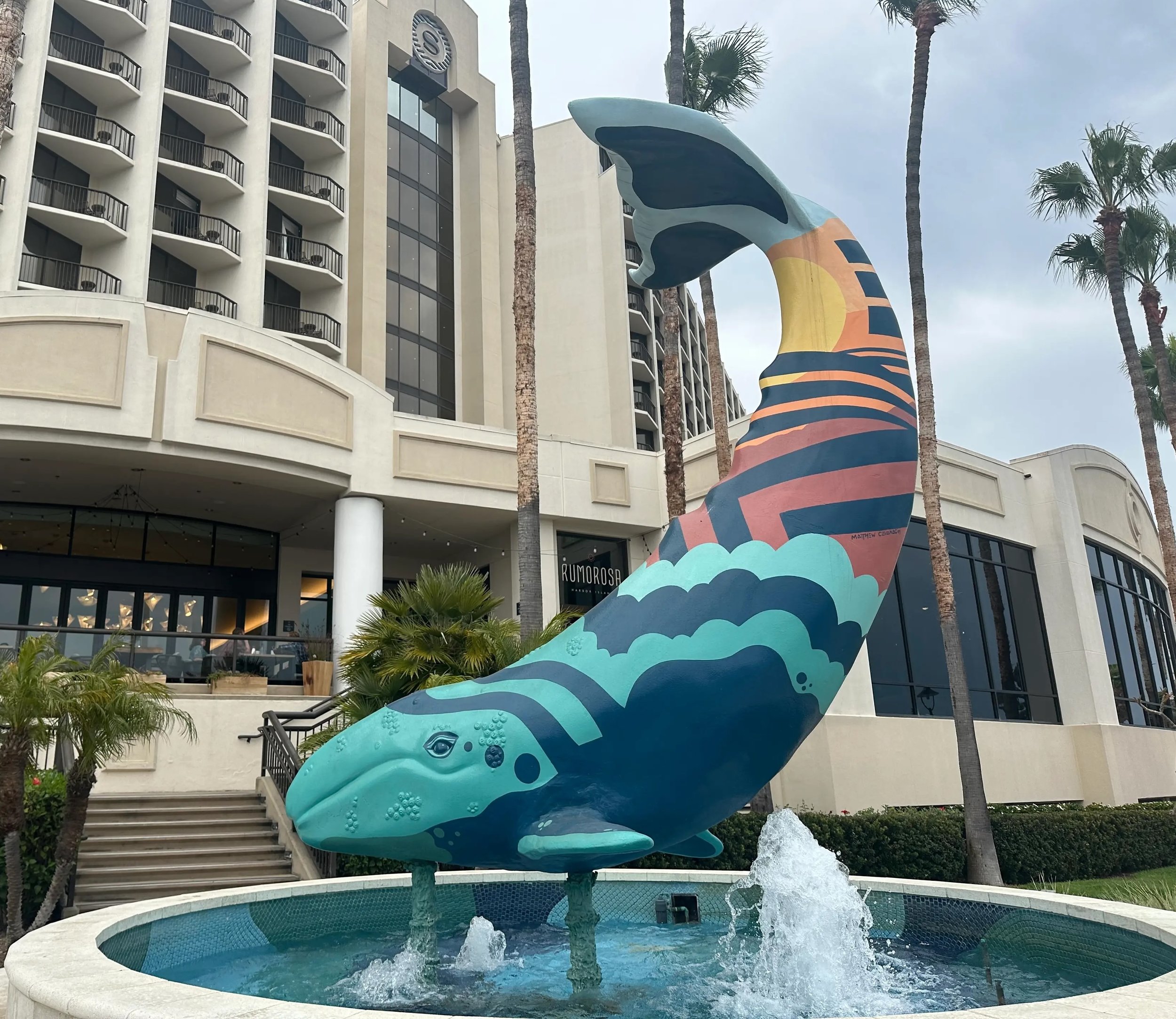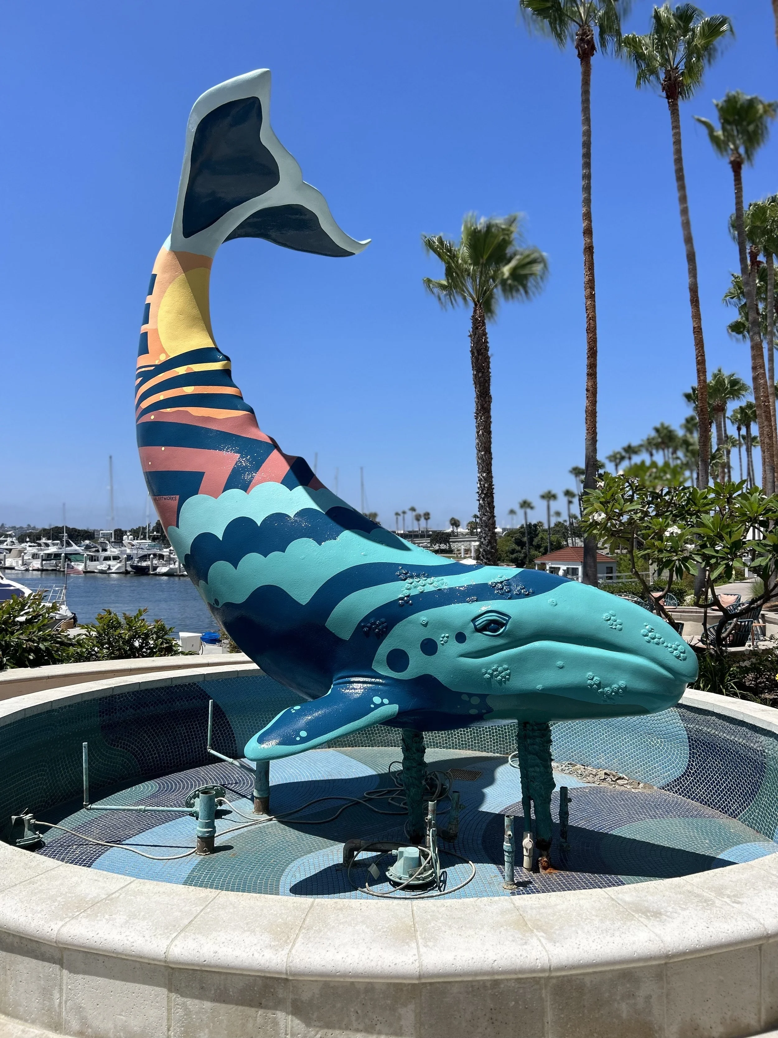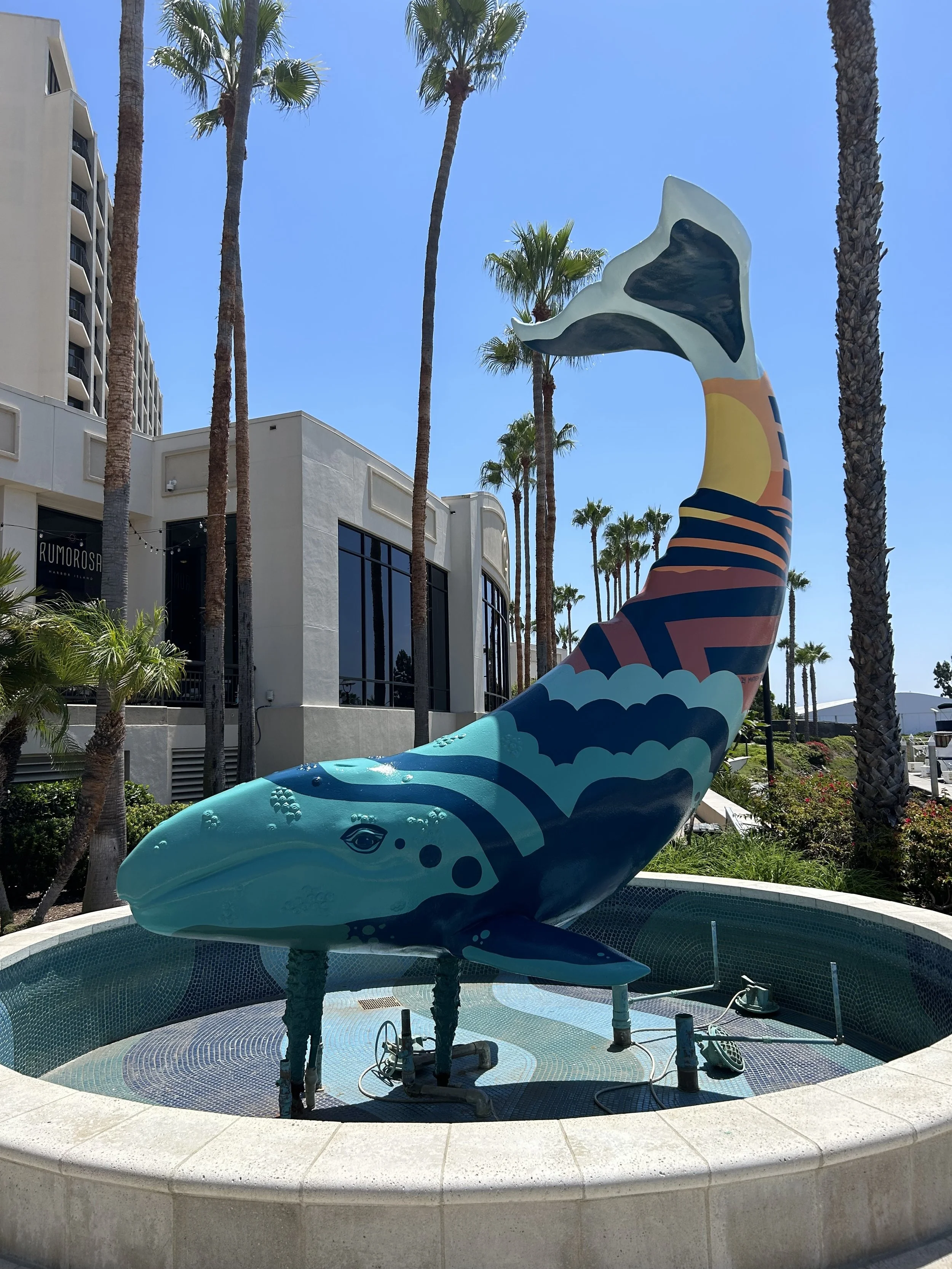 RESTORED AND HAND PAINTED AN OLD RUSTY WHALE SCULPTURE AT SHERATON RESORT SAN DIEGO, CA.